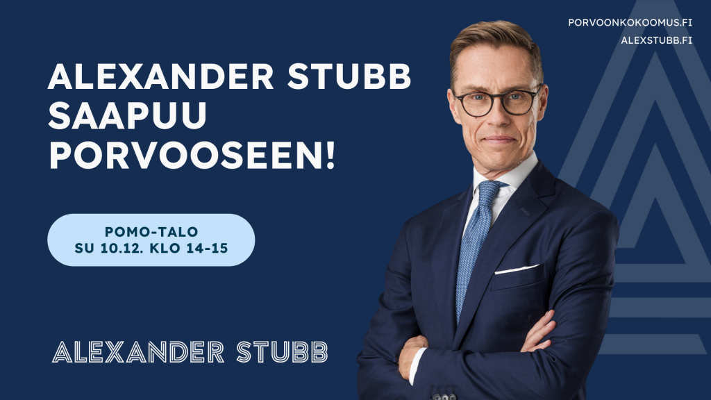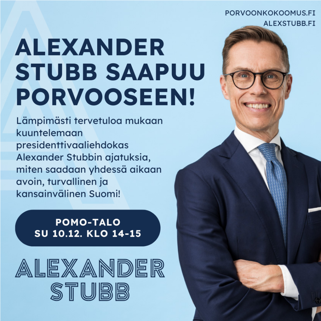 Porvoon Kokoomus yhteistyössä Uudenmaan Kokoomuksen kanssa järjestää presidenttivaaliehdokkaan Alexander Stubbin vierailun Porvoon POMO-talolla (Aleksanterinkatu 20) sunnuntaina 10.12.2023. Lämpimästi tervetuloa mukaan!