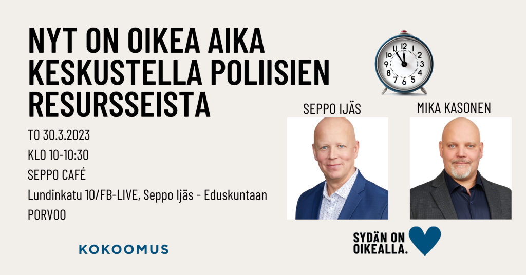 Tervetuloa keskustelemaan turvallisuudesta ja poliisien resursseista Porvoon Kokoomuksen vaalikahvila Seppo Caféseen. Paikalla eduskuntavaaliehdokkaat vanhempi konstaapeli Seppo Ijäs ja ylikonstaapeli Mika Kasonen.