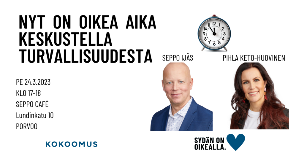 Tervetuloa keskustelemaan turvallisuudesta Porvoon Kokoomuksen vaalikahvila Seppo Caféseen Lundinkatu 10, Porvoo pe 24.3.2023 klo 17-18.
